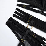 Adriana | Elegantiškas apatinis trikotažas nėra tik paprasti apatiniai, tai yra pagarbos ženklas jūsų moteriškumui. Kiekviena šio komplekto detalė, kurią sudaro liemenėlė, kelnaitės ir dirželis, yra puošta elegantiška prancūziška nėriniuota, kuri pabrėžia jūsų natūralią grožį. Šis išskirtinis komplektas ne tik užtikrina puikų prigludimą, bet ir suteikia jums pageidaujamą komfortą. Aukštos kokybės spandekso ir nailono naudojimas užtikrina, kad seksualus apatinis trikotažas maloniai jausis ant odos ir užtikrins tobulą prigludimą.