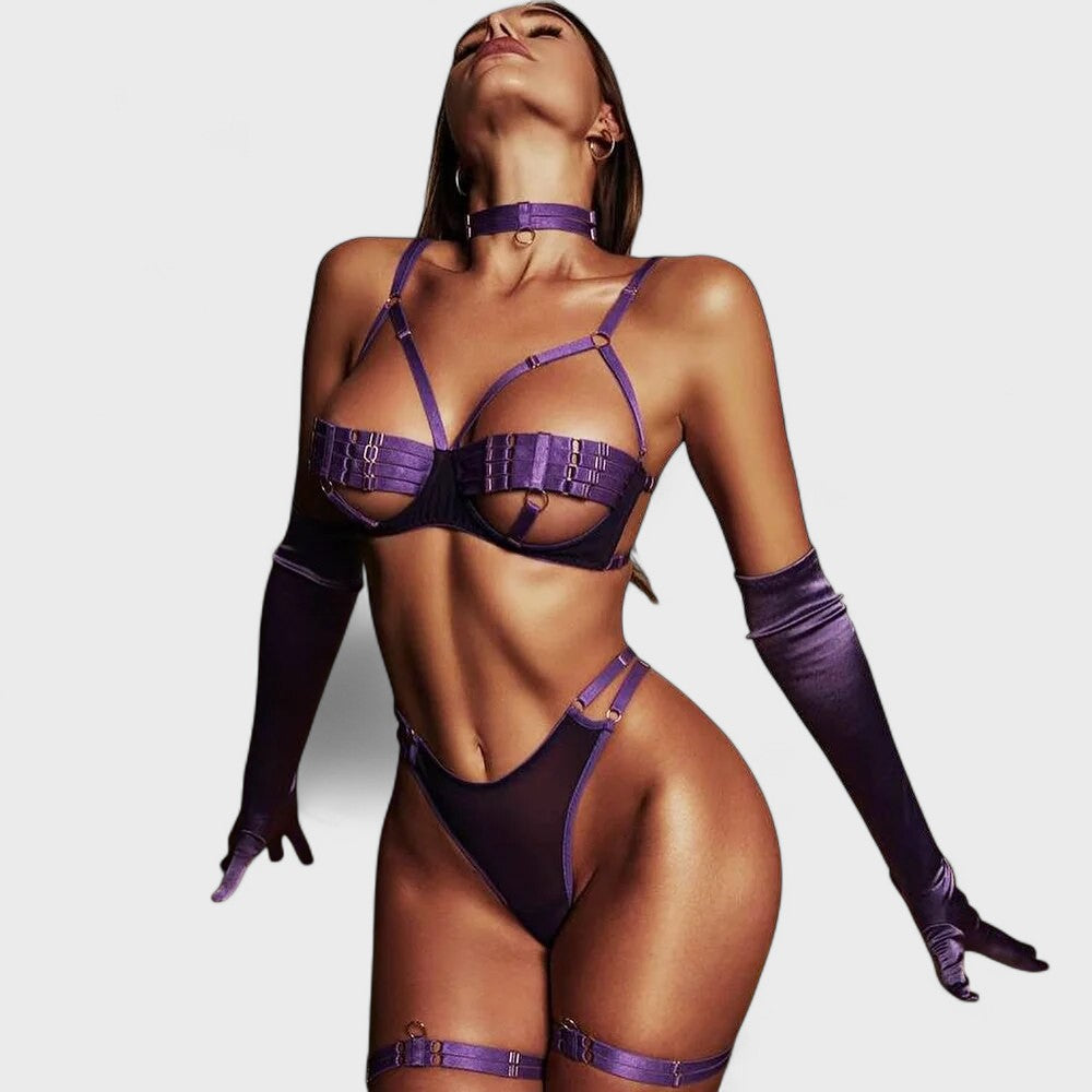 Atraskite Amanda | Elegantiškas apatinis trikotažas, kuris sujungia eleganciją, komfortą ir stilių tobulai harmonijoje. Šis išskirtinis komplektas, sudarytas iš liemenėlės, kelnaičių, kaklo diržo ir kojinių, siūlo ne tik viliojančius seksualius apatinius, bet ir prabangos jausmą, kuris sužavės kiekvieną moterį. Pagamintas iš aukštos kokybės poliesterio, šis komplektas užtikrina malonų dėvėjimosi komfortą ir puikiai pritaikytą formą, kuri pabrėžia jūsų formas.