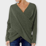 ✔️ Stilingas dizainas su V formos iškirpte: Madinga kryžminė V formos iškirptė ir asimetrinė apatinė dalis suteikia šiam megztiniui unikalų akcentą.