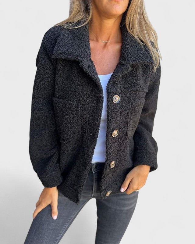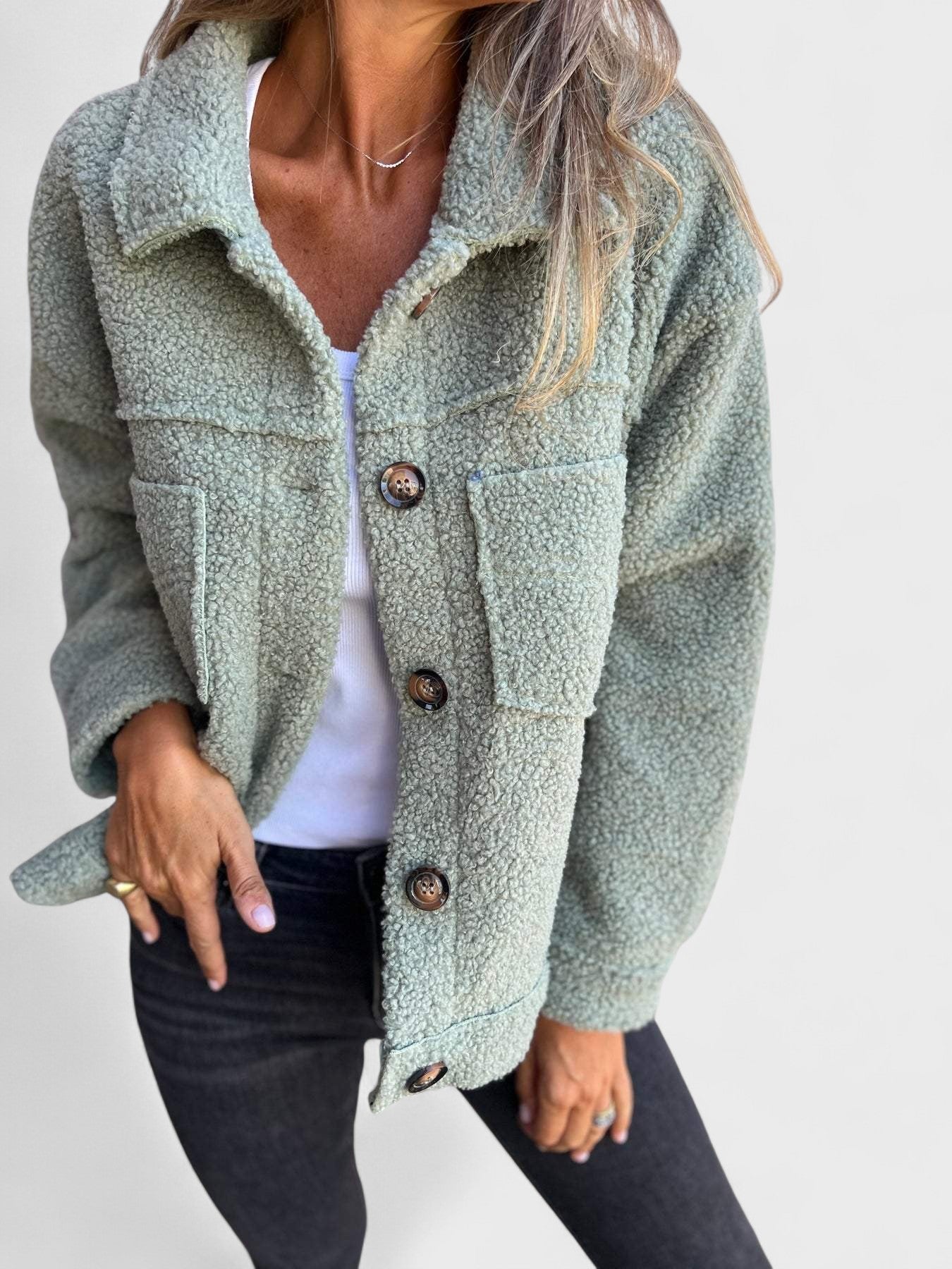 Ši striukė suteikia šilumos ir atsipalaidavusio stiliaus jūsų kasdieniam garderobui. Jos trumpa ir kvadratinė forma su klasikiniais atlapais sujungia struktūrą ir švelnumą. Paprasta mygtukų uždarymo sistema ir kišenės suteikia subtilių detalių, o striukės tekstūra suteikia malonų ir šiltą prisilietimą. Ji puikiai tinka pasivaikščiojimams mieste, atsipalaidavusioms išvykoms ar ramiai vakarienei.