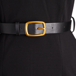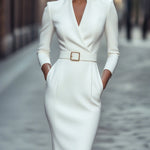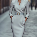 Ši suknelė turi išskirtinį imitacinį apvyniojimo iškirpimą, trijų ketvirčių rankoves ir elegantišką pieštuko siluetą. Struktūrizuotas diržas su kvadratiniu sagtimi pabrėžia liemenį. Prigludęs dizainas seka natūralius kūno kontūrus, tuo pačiu siūlydamas švarias, lygias linijas. Subtili pečių struktūra ir šoninės kišenės prideda funkcionalumo, nesumažinant stiliaus. Prieinama dydžiuose nuo XS iki 2XL kiekvienam kūno tipui.