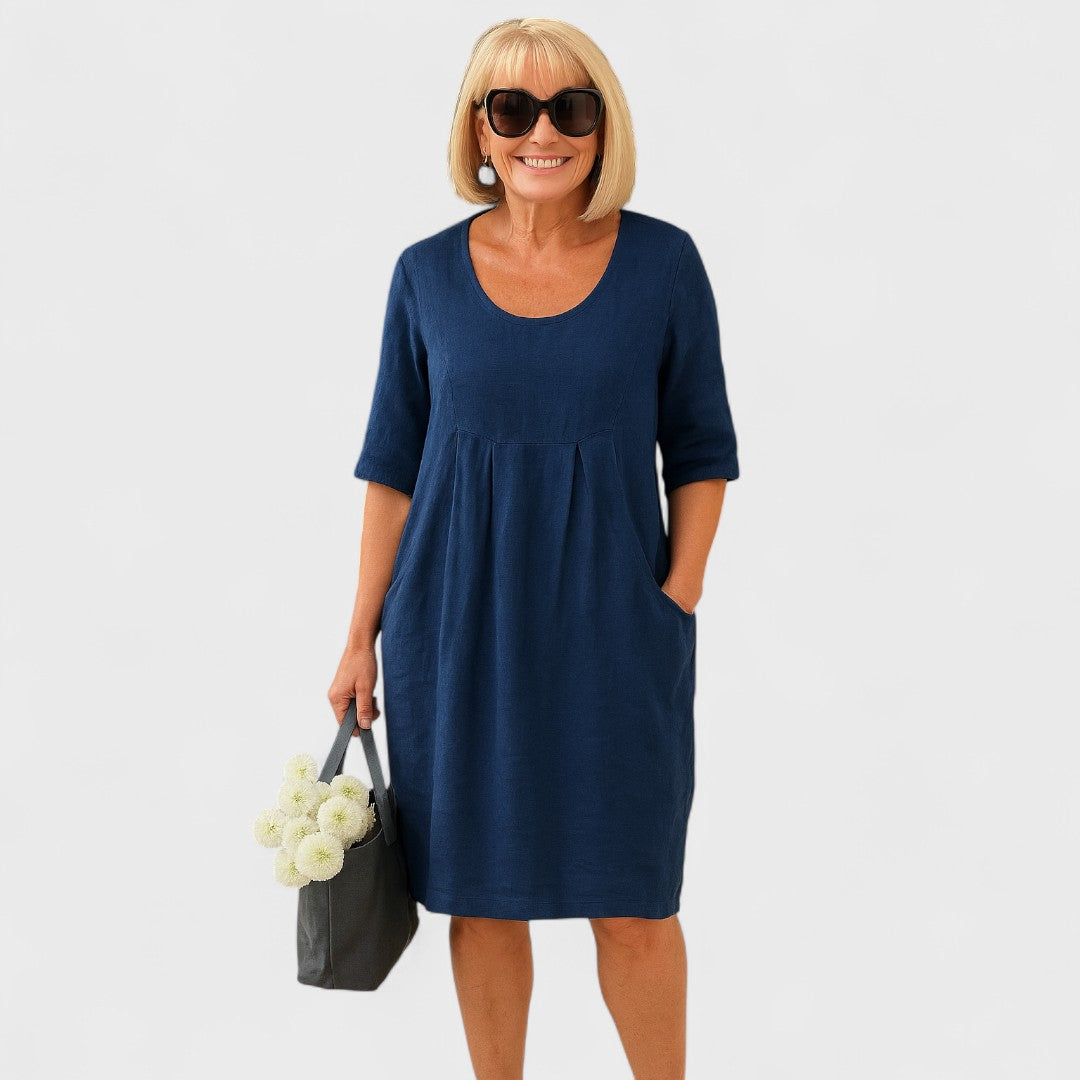 Ši lino suknelė, sukurta kasdieniam dėvėjimui, leis jums jaustis patogiai ir laisvai. Ji turi apvalią iškirptę, atsipalaidavusią siluetą ir praktiškas šonines kišenes, todėl tai ideali apranga šiltesnėms dienoms, pasivaikščiojimams sode ar atsitiktiniams pasimatymams. Paprasta, kvėpuojanti ir tinkama visoms amžiaus grupėms.