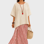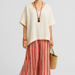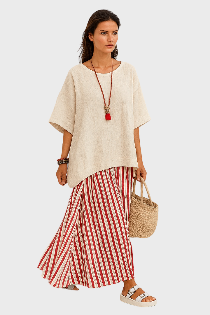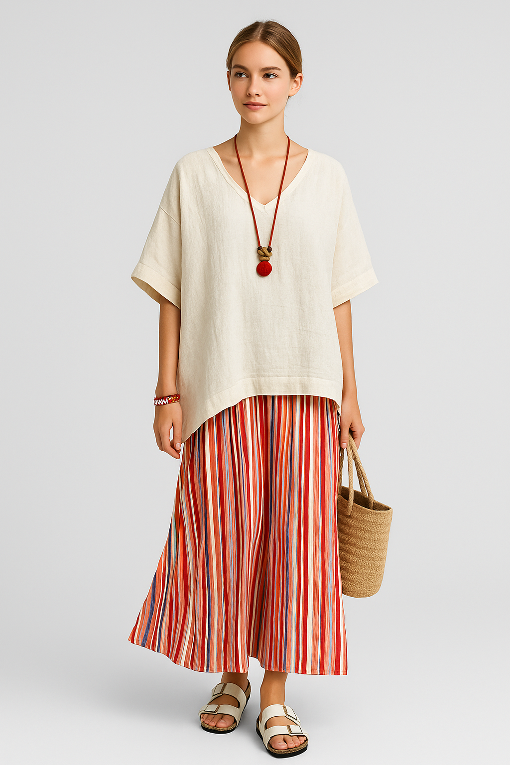 Ši suknelė yra lengva ir labai gaivi, pagaminta iš audinio, kuris leidžia odai kvėpuoti, net ir karščiausiomis dienomis. Jos laisvas kirpimas pabrėžia siluetą, suteikdamas komfortą ir judėjimo laisvę. Puikiai tinka tiems, kurie ieško praktiško įvaizdžio, neprarandant elegancijos, idealiai tinka pasivaikščiojimams, šventėms lauke ar kasdienei dienai. Be to, ji lengvai derinama su įvairiais aksesuarais, suteikdama tavo stiliui gaivumo ir natūralios rafinuotumo.”