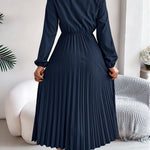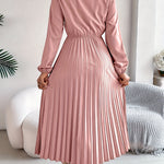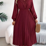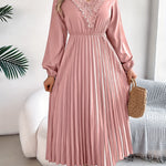 Ši elegantiška suknelė turi gražiai klostuotą A formos sijoną, kuris natūraliai juda kiekvienu žingsniu. Ilgos rankovės suteikia uždengimą, o šiek tiek pūsta apykaklė sukuria moterišką siluetą. Nėriniuotas V formos kaklas pritraukia žvilgsnį į viršų, sukurdama patrauklų rėmą aplink veidą. Susiaurinta juosmens linija pagerina formą, nesijaučiant per daug aptemptai, todėl idealiai tinka visai dienai.